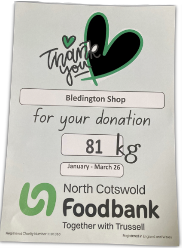 On behalf of the North Cotswold Foodbank we would like to thank everyone in the village who has generously supported our ongoing collection for the Cotswold Foodbank.
